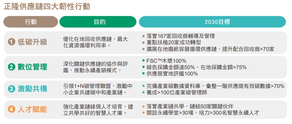 洞見零碳經濟下的關稅風險及產業契機,2023年正隆即著手打造產業碳數據資料庫,攜手20家產業鏈夥伴,組建造紙業首例碳中和聯盟,並完成台灣首例工業用紙碳足跡盤查,每年達成減碳效益近12,000公噸、節省超過5,500萬元的能源成本。2024年,更創建「正隆iPAS工控資安暨智慧製造供應鏈專班」,完備工控資安人才庫,強化紙業數位及風險管理韌性。正隆張清標總經理強調:「永續不能單打獨鬥,重視在地供應鏈ESG競爭力,正隆持續深化供應商議合行動,確保正隆供應鏈的低碳產品,在淨零趨勢下始終為全球大廠的優先選擇。」為加速推動造紙產業升級低碳智慧製造競爭力,正隆聚焦300家關鍵供應鏈夥伴的「淨零『智』造:淨零轉型、智慧製造」雙軸轉型,並提出四大永續韌性行動,以及超過15項行動目標。
