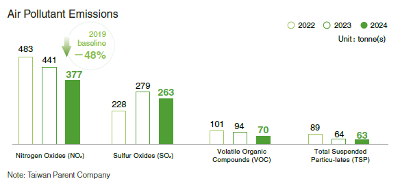 We established long-term air pollution reduction targets and continuously reduced emissions through process improvements and upgrades to emission treatment equipment. In 2024, NOx emission concentration in the Taiwan area decreased by 48% compared to the 2019 baseline, significantly exceeding the annual reduction target of 15%.