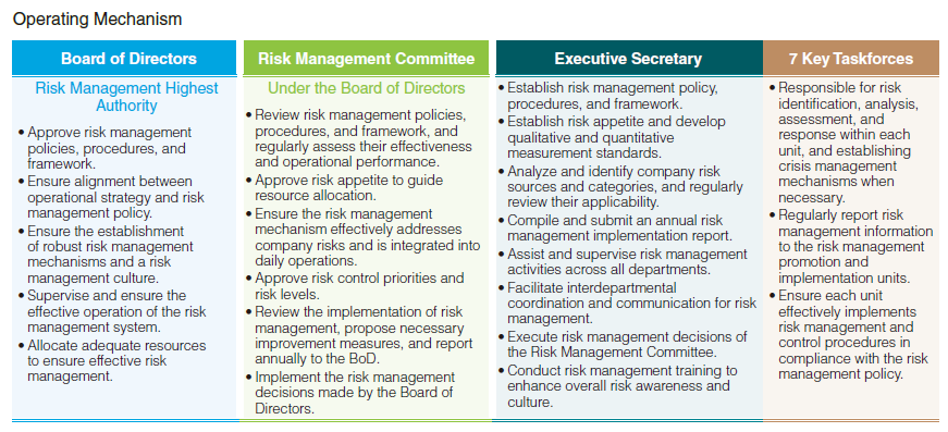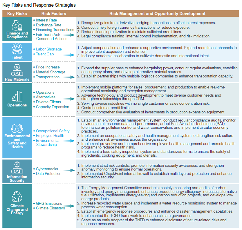 Implementing risk management systems and operations is a crucial foundation for ensuring CLC's stable operations. The Board of Directors is responsible for overseeing risk governance. At the end of 2023, the Board approved the establishment of a Risk Management Committee to assist in supervising the risk management system, including reviewing the company's risk management structure and processes to facilitate risk identification and management, and reporting major issues, findings, and recommendations related to risk management to the Board. In 2023, the company also revised the "Risk Management Policy and Procedures," emphasizing Cheng Loong's commitment to a sound and effective risk management system and culture. This includes integrating and managing all potential risks, authorizing the General Manager to make risk management decisions, and ensuring that departments follow risk management procedures to properly identify and manage internal and external risks, and assess the impact of operational, financial, and climate change risks on the company.