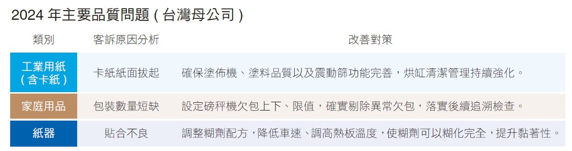 針對未能達標及客訴件數多的項目,本公司設有品質精進小組進行改善工作,力求務實改善,確保不影響客戶權益。未來,公司也會持續強化教育訓練與導入數位化管理,全面提升生產面和服務面的品質,致力於將客訴降至最低,達到2025年所訂定目標。同時,正隆訂下於2025年改版優化海外越南以及大陸廠區客訴系統的目標,以利掌握重複性問題與潛在風險,作為品質改善與產品創新的依據,提升整體顧客滿意度與信賴感。