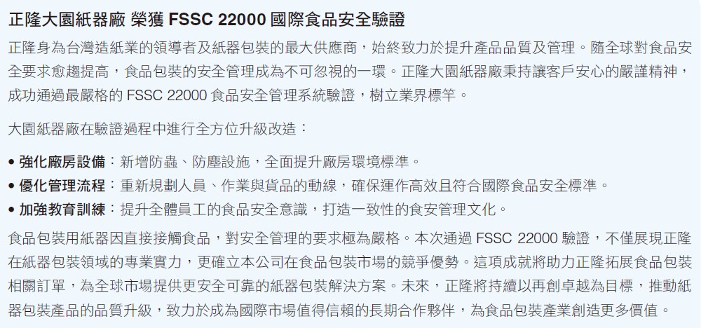 工紙產品每年進行公證檢驗機構有害物質含量檢測,測試項目對標歐盟等國際指標,如歐盟危害性物質限用規範(RoHS)、鹵素含量規範、歐盟(EN71-3)玩具重金屬限用規範等。2024年各項產品測試結果皆符合法規規範,大園紙器廠更通過FSSC 22000國際食品安全驗證,提供客戶更高品質、安全可靠的紙包裝方案。