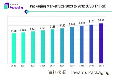 在全球電商市場持續成長的帶動下,包裝市場規模預計將從2023年的1.20兆美元成長到2032年的1.58兆美元,年複合成長率達3.1%。而台灣環境部2021年公布統計,全台一年可用掉2.2億組一次性網購包裝,且該數據預計將在2030年翻倍,顯示市場對包裝的需求仍將持續增加。與此同時,包裝產業過去十年在技術發展與市場偏好的推動下,持續朝數位化與綠色創新的方向變革。在此趨勢下,企業唯有積極推動永續包裝策略,才能降低環境影響、符合市場期待,並在競爭激烈的產業中脫穎而出。