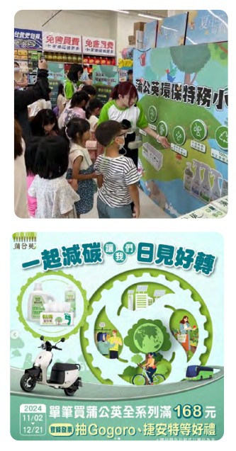 不忽略與消費者面對面溝通的機會,線下則攜手家樂福多家門市舉辦「蒲公英環保特務小學院」,透過互動體驗,讓綠色消費與永續觀念融入孩子的生活。同時,蒲公英與2023/24米其林入選餐廳推動「一起減碳 讓我們日見好轉」,倡導永續飲食,並配合發票登錄活動,實踐「淨零綠生活—綠色飲食」的生活態度。