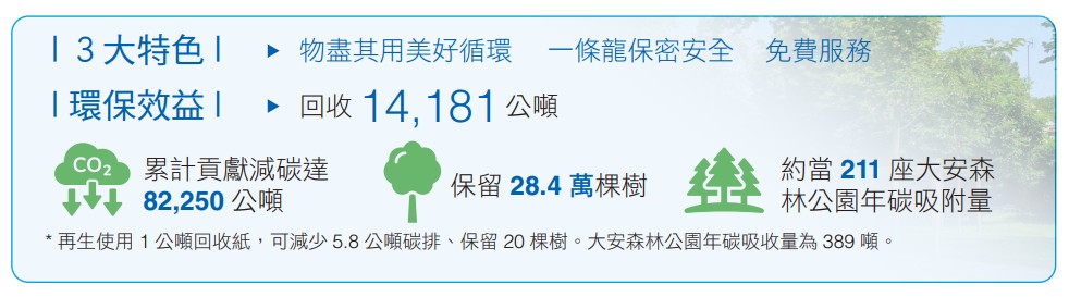 透過產品生命週期:原料使用、產品設計、綠色生產、物流配送,到最終端的消費,以「再生資源─造紙─包裝」,創造循環經濟效益。