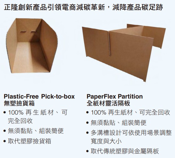 此外,針對大型電商倉儲,正隆創新研發多款環保貨架隔板與檢貨箱,全產品採100%紙材製造,可快速組裝並靈活調整尺寸,獲國際知名電商品牌採用。這些創意開發不僅可減少資源消耗,更能助電商業者在倉儲管理中降低對塑膠的依賴,推動供應鏈減碳、跟上全球綠色倉儲趨勢,打造更具競爭力的永續物流體系。