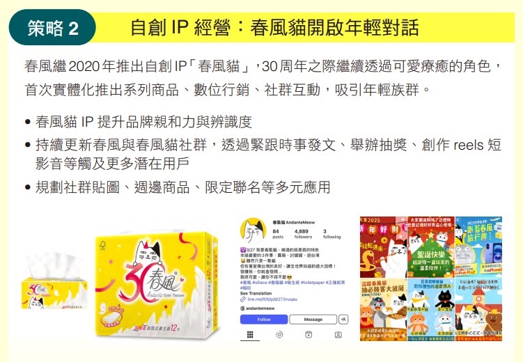順應全球低碳減塑與自然為本解方趨勢,正隆於2024年推出「蒲公英環保便利包抽取衛生紙」與「Andante安蝶媞在地萃取潔顏系列」,以環保創新提升消費體驗。迎接2025年春風品牌成立30週年,將推出「盒裝面紙使用全紙材不裱膜」等創新產品,讓永續從日常開始,陪伴消費者輕鬆實踐環保生活,並持續強化永續特色,陪伴消費者邁向下一個30年。