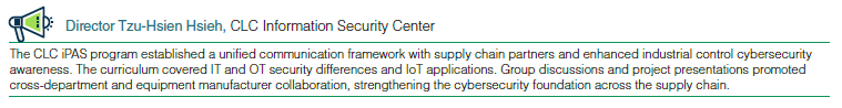 - CLC partnered with the Ministry of Economic Affairs to launch the iPAS Supply Chain Training Program, providing training on smart manufacturing, industrial control system cybersecurity, and the IEC62443 standard to strengthen supply chain cybersecurity and ensure security compliance with equipment suppliers. Group discussions and cross-department, cross-plant participation deepened collaboration between internal teams and supply chain partners, establishing a foundation for future cooperation.