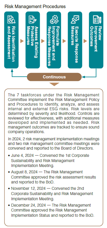 Implementing risk management systems and operations is a crucial foundation for ensuring CLC's stable operations. The Board of Directors is responsible for overseeing risk governance. At the end of 2023, the Board approved the establishment of a Risk Management Committee to assist in supervising the risk management system, including reviewing the company's risk management structure and processes to facilitate risk identification and management, and reporting major issues, findings, and recommendations related to risk management to the Board. In 2023, the company also revised the "Risk Management Policy and Procedures," emphasizing Cheng Loong's commitment to a sound and effective risk management system and culture. This includes integrating and managing all potential risks, authorizing the General Manager to make risk management decisions, and ensuring that departments follow risk management procedures to properly identify and manage internal and external risks, and assess the impact of operational, financial, and climate change risks on the company.