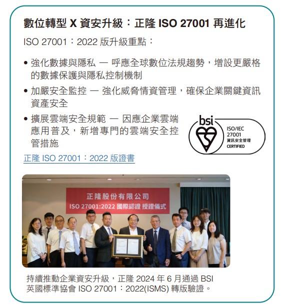 - 1. 完善資安管理制度度,2023 年領先業界導入 ISO 27001 資訊安全管理系統 (ISMS),並於2024年6月完成 ISO 27001:2022 版本的轉版認證。未來,正隆將持續投入資源,遵循 ISO 27001 標準,並結合公司需求推動技術創新與管理升級,以打造更安全、可靠的資訊環境。