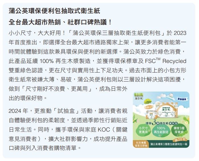 為拓展環保家用紙市場並響應政府淨零綠生活政策,蒲公英2023年起於超市通路全聯福利中心,獨家推出便利包環保抽取式衛生紙,並為家樂福開發三層大包裝、抽數增量20%,提升綠色商品可觸及性。2024年進一步推出碳足跡改版包裝,強化與消費者溝通正隆永續舉措。同年,蒲公英系列銷售突破3,800萬包,年增10.83%,市場普及率穩步提升。