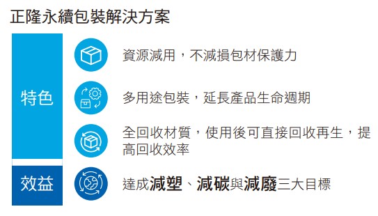 秉持3R原則—減量(Reduce)、再利用(Reuse)、回收再生(Recycle),正隆作為全台最大的紙包裝供應商,從產品生命週期出發,致力於開發低碳、去塑和輕磅化的多功能包裝產品,協助市場落實綠色消費、有效減少浪費。透過科研技術,不僅降低產品碳足跡,更確保包材保護力,同時提升物流配送效率,進一步放大減碳效益。2023年,正隆亦率先完成工業用紙首例產品碳足跡盤查,確保「正隆低碳工紙」成為國際減碳趨勢下,全球領導品牌的首選夥伴。