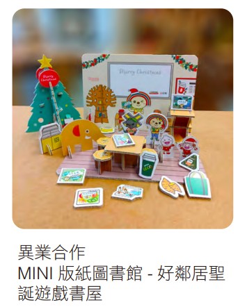 紙樂屋也和「統一超商好鄰居文教基金會」異業合作,推出「好鄰居聖誕遊戲書屋」,以紙圖書館為場景,結合MINI版紙樂屋商品 - 我的小桌、小樹椅、展示書架以及小象等,搭配「蒲公英」小蒲、小英人偶,讓孩童在遊戲中認識回收紙的無限潛能。