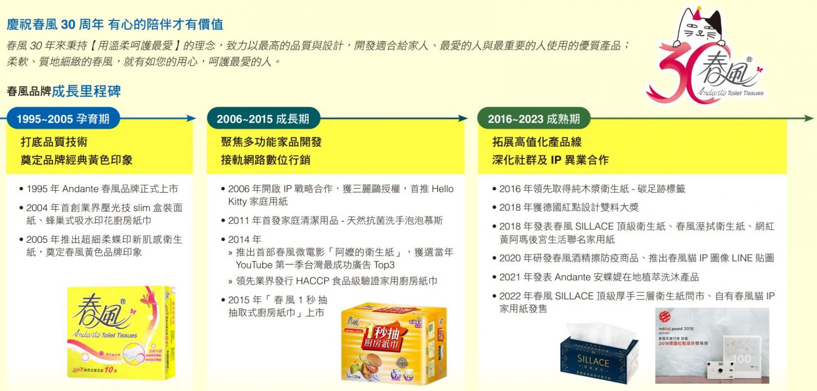 順應全球低碳減塑與自然為本解方趨勢,正隆於2024年推出「蒲公英環保便利包抽取衛生紙」與「Andante安蝶媞在地萃取潔顏系列」,以環保創新提升消費體驗。迎接2025年春風品牌成立30週年,將推出「盒裝面紙使用全紙材不裱膜」等創新產品,讓永續從日常開始,陪伴消費者輕鬆實踐環保生活,並持續強化永續特色,陪伴消費者邁向下一個30年。
